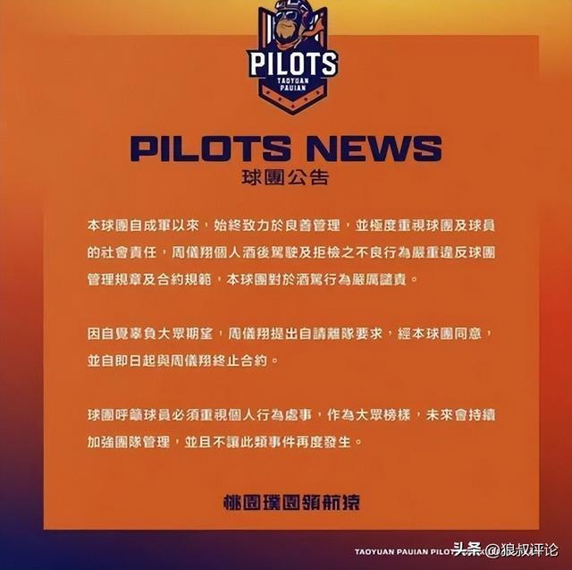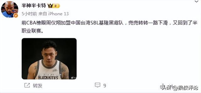 北京时间10月22日,根据媒体人“半神半卡特”报道,前CBA榜眼周仪翔加盟中国台湾SBL基隆黑鸢队,又回到了半职业联赛。 去年,周仪翔因酒驾拒检引发外界的热议,P联赛桃园领航猿队官方宣布,球员周仪翔酒后驾驶并抗拒检查,违反了球队的相关条例规定,自今日起正式终止与其合约。 周仪翔是2017年的CBA选秀榜眼,代表过同曦,新疆,北京效力,5个赛季换了3支球队,其中,在新疆男篮打出自身的特点后,他获得了北京首钢青睐,但三个赛季的整体表现与预期相比存在比较大的差距。 2021-2022赛季,随着周仪翔合同到期,北京首钢并没有送出续约合同,最终,周仪翔结束了5年的CBA职业生涯。周仪翔随后加盟P联赛的高雄钢铁人,状态开始直线下滑,一度被不少中国台北P联赛球迷调侃为“交通指挥员”。 不久后,周仪翔被交易到桃园领航猿,虽然周仪翔随领航猿打进PLG当年总决赛,但状态依旧不佳、没有为球队主力得分手卢峻翔提供足够支持,球队也最终1:4输给新北国王。而外界重点关注的周仪翔酒驾,车上乘客还有其钢铁人前队友、这个休赛期刚刚加盟新北国王的吕政儒。后者则因为未能及时制止酒驾行为,被国王球团罚款50万新台币。
