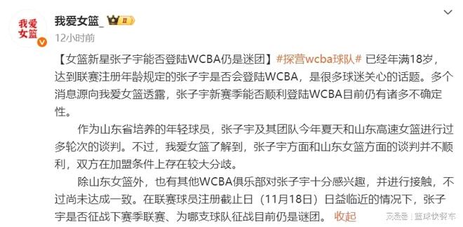 2米28的张子宇可能还打不了WCBA联赛。根据知情人士透露,作为中国女篮最具潜力的超级新人,张子宇新赛季可能还打不了WCBA联赛。过去两个赛季,外界对于张子宇征战职业联赛呼声非常高。上赛季,由于未满18岁缘故,张子宇被WCBA联赛拒绝在大门之外。新赛季,年满18岁的张子宇,能否登陆WCBA联赛,还是一个未知数。随着WCBA新赛季注册截止日期的临近,张子宇能否出战新赛季,将会是一个谜?众所周知,张子宇是过去十年里,女篮球员中关注度最大的一个。即便是巅峰的李梦、李月汝、韩旭等人,他们在同龄时期,也没有张子宇这样的关注度。自从2020年以后,张子宇便一直备受外界关注。在U15联赛中,张子宇早已大杀四方,鹤立鸡群。而在参加U18亚青赛上,张子宇更是成为了对手的噩梦,场均砍下35分12.8板的恐怖数据。然而,就是这样一个大杀器,她却始终与职业联赛无缘。过去两个赛季,外界不少人一直呼吁,让张子宇尽快进入到职业联赛历练,毕竟,青年队已经无法满足她了。然而,根据WCBA现有的规则,球员必须年满18岁以后,才能够注册征战职业联赛。这也就意味着,2007年出生的张子宇,并没有达到征战WCBA联赛的要求。因此,张子宇也错过了进入WCBA联赛的机会。2025-26赛季,张子宇终于年满18岁了,这一次,她终于达到了征战职业联赛的要求。这下,终于没有任何理由可以阻挡这个小巨人进入职业联赛了。然而,根据知情人士透露,张子宇目前还未确定能否出战新赛季。据悉,她与山东队在签约问题上存在比较大的分歧,双方暂时还没有签约。而且,也不少球队对于张子宇感兴趣,并且向她伸出橄榄枝,希望她能够加盟。从个人能力上来讲,张子宇确实已经具备征战职业联赛的实力,而且,她也已经满足年龄上的要求。不过,由于她与山东队的谈判存在分歧,双方就签约问题存在不统一意见。如果张子宇不愿意“委屈”,那么,山东队也不可能会轻易放走张子宇。换句话说,其他球队想要得到张子宇这个巨无霸,恐怕也没有那么容易。如果双方的谈判陷入到僵局,那么,最终的结果可能会两败俱伤,张子宇存在打不了WCBA联赛的可能。目前,距离WCBA新赛季本土球员注册截止日期还是半个月,如果在11月18日,张子宇与山东队还未能谈妥的话,那么,她还真有可能会打不了WCBA联赛。当然,这种结果可能是张子宇、山东队以及球迷们,最不愿意看到的一幕。由于张子宇接下来还有全运会任务,她将代表山东队出战U18女篮全运组的比赛。在全运会结束后,留给他们谈判的时间已经不多了,张子宇真的还能赶上吗?