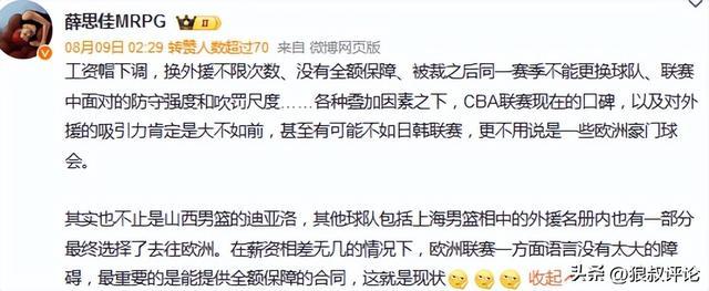 媒体人付政浩曾发文点评:工资帽下调,换外援不限次数、没有全额保障、被裁之后同一赛季不能更换球队、联赛中面对的防守强度和吹罚尺度……各种叠加因素之下,CBA联赛现在的口碑,以及对外援的吸引力肯定是大不如前,甚至有可能不如日韩联赛,更不用说是一些欧洲豪门球会。其实也不止是山西男篮的迪亚洛,其他球队包括上海男篮相中的外援名册内也有一部分最终选择了去往欧洲。在薪资相差无几的情况下,欧洲联赛一方面语言没有太大的障碍,最重要的是能提供全额保障的合同,这就是现状。