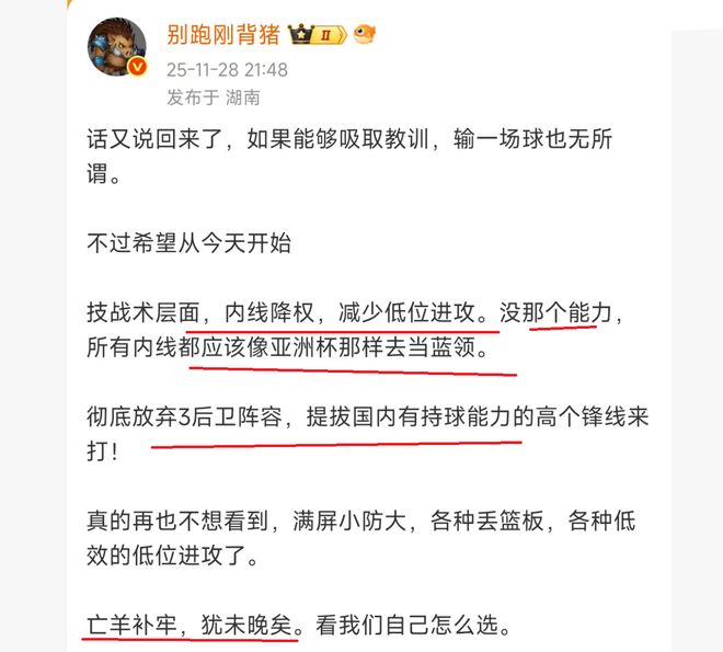中国男篮输给韩国队4分!CBA名记痛批郭士强:太迷恋一人+战术错误,是导致中国男篮输球的关键原因。希望郭士强亡羊补牢……昨晚,中国男篮在主场输给了韩国队4分,对于这样的一个结果, 很多国内球迷都是接受不了,在赛前,大家根本就没有想到会输,只想到会赢,就算不是大胜,小胜也是可以。然而,中国男篮的表现,却再一次刷新了下限,在自己的主场以76-80输给了韩国队,让人大跌眼镜。那么,中国男篮为何会输给实力不如自己的韩国队呢?对于这个问题,CBA名记“别跑刚背猪”在赛后也进行了点评,他认为中国男篮输球主要责任是主教练郭士强,是他太信赖周琦的个人进攻能力+用人战术错误,从而导致球队输球。“别跑刚背猪”表示,在比赛中,周琦很多低位进攻,这是非常传统的打法,然而,周琦的能力摆在这里,他并没有姚明这样的内线杀伤力,结果,大家也是看到了,周琦内线单打的效果很糟糕,就算是获得了罚球,周琦罚球命中率也只有五成,十分尴尬。所以,“别跑刚背猪”认为应该要减少低位进攻,中锋要去当篮领,别当大哥。还有一个就是郭士强在用人方面,出现了巨大的问题,喜欢用三后卫战术,用后卫去防守对方的锋线球员,结果,以小防大,被对手一次又一次在头上投进三分球,十分尴尬。同时,由于场上球员的身高不够,也导致不断丢掉篮板球。原本中国男篮球员有身高优势,然而,郭士强却放弃了自己的优势,显然这样做法,就是自废武功。因此,“别跑刚背猪”建议郭士强,要彻底放弃3后卫阵容,提拔国内有持球能力的高个锋线来打!正所谓,亡羊补牢,犹未晚矣。那么,接下来就看郭士强会做出什么样的选择了。实话实说:这批中国男篮球员,虽然不如姚明时期,但是,他们的身体条件,在亚洲地区来讲,依然是最为顶级的存在,至于,他们为何会打不出成绩,在最近几年不断输球,一个非常关键的因素,就是主教练不行,主教练水平不行,能力不行,战术不行。所以,如何提升主教练的战术素质,这对中国男篮的未来也是十分重要。各位看官,你们说呢?