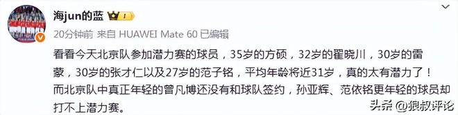 媒体人“海jun的蓝”发文点评:“看看今天北京队参加潜力赛的球员,35岁的方硕,32岁的翟晓川,30岁的雷蒙,30岁的张才仁以及27岁的范子铭,平均年龄将近31岁,真的太有潜力了!而北京队中真正年轻的曾凡博还没有和球队签约,张知垚、孙亚辉、范依铭更年轻的球员却打不上潜力赛。不得不说一句 : “篮协,潜力赛这盛世如你所愿!”