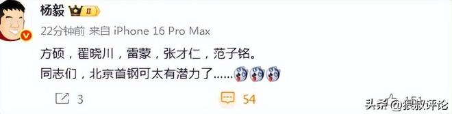 媒体人杨毅发文点评:“方硕,翟晓川,雷蒙,张才仁,范子铭。同志们,北京首钢可太有潜力了”。