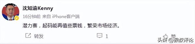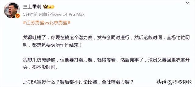 媒体人“三土带刺”发文点评:“我得吐槽了,你现在搞这个潜力赛,发布会同时进行,然后这段时间,全场忙忙叨叨,都感觉要匆匆忙忙结束!我想采访庞峥麟,但他要打潜力赛,就得等着,然后完事了,球员又要回更衣室开会,根本没时间。那CBA宣传什么?赛后都不讨论比赛,全吐槽潜力赛? ”