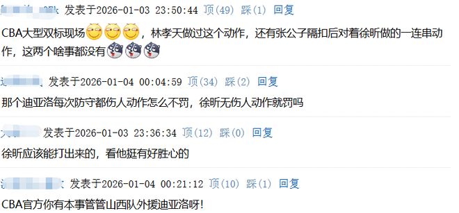 一个庆祝动作就要罚款2万?这就有点离谱了,2万数目虽然不大,但对于徐昕来说,也是笔不小的支出,毕竟徐昕现在拿的还是B类合同,据说年薪并不高,这无疑是笔重罚。CBA公司的做法也有点让人看不懂,评论区球迷们也是纷纷表达了不满,并且还举出了很多例子打脸CBA,有球迷认为:当时徐昕做出这个动作的时候,裁判都没有表示,迪亚洛那么多防守伤人动作怎么就不处罚?
