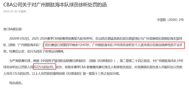 根据CBA官网给出的罚单公告,徐昕是在个人进攻得分后做出了挑衅性的不当手势,经赛后认定,此行为违反了体育运动精神,为严肃联赛纪律,根据《中国男子篮球职业联赛纪律准则》(简称《纪律准则》),第二章第二十四条之规定,对徐昕处以罚款人民币2万元的处罚。此外,依照本赛季CBA联赛赛风赛纪责任人制度相关规定,对龙狮俱乐部负责人何振轩处以罚款人民币1万元的处罚。