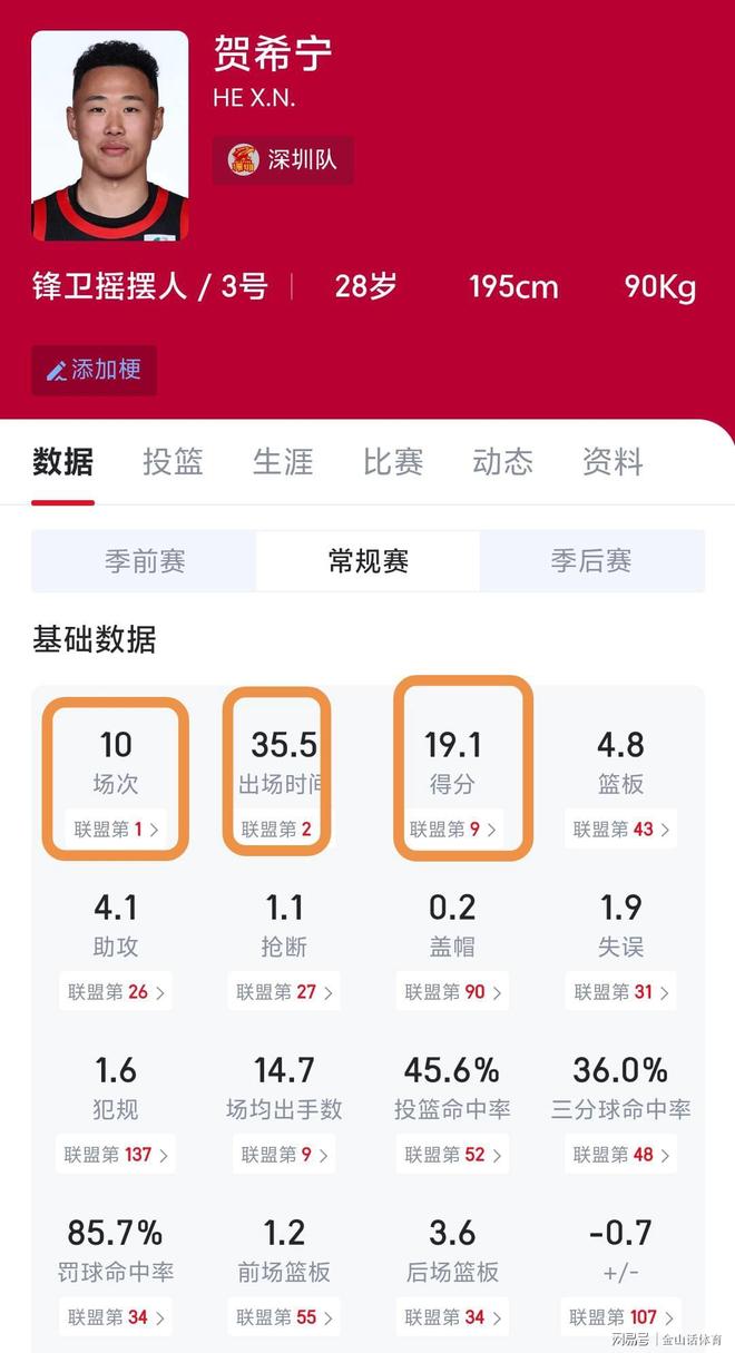 全场打满40分,如此超负荷运转,也让球迷们心疼不已。“把贺希宁当牛一样使啊?打满40分钟。”;“生产队的驴都不带这么用的”;“牛都不敢这样用啊。真牛逼”;“老贺每场都这么用要不得,赛季漫长,这么用迟早要出问题的。一旦老贺伤了,有深圳队哭的时候,唉!”……
