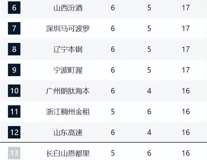 而6-10全部都是6胜,分别是山西、深圳、辽宁、宁波和广州。其中山西、深圳和辽宁都是两连胜,之前山西与辽宁遭遇连败,这两场比赛算是让他们缓口气了,不过后续能不能继续保持好的趋势还是未知数,因为球队的弊端没有改变。宁波这轮即便惜败北京,他们本赛季必然会成为搅局者。广州则少打一场比赛,这轮拿下新疆之后,已经三连胜了。