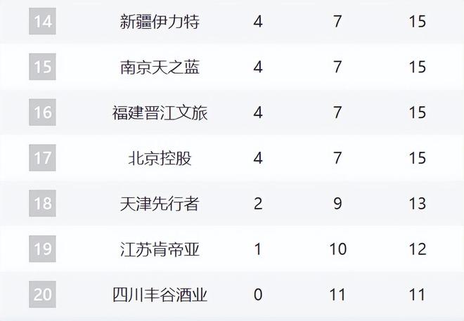 天津、江苏和四川都是难兄难弟。当然天津这轮击败北控,难得拿下一场胜利,但他们基本上就是锁定倒数了。