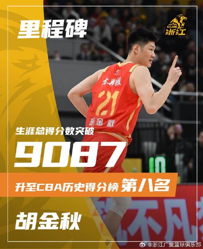 北京时间1月11日,2025-26赛季CBA常规赛卫冕冠军广厦客场对阵宁波,广厦FMVP布朗继续因伤缺席。广厦借助团队攻势逐步扩大22分领先优势,并且挡住宁波的顽强追分,最终广厦84-78战胜宁波收获2连胜。值得一提的是,胡金秋CBA生涯得分总计为9101分,超越唐正东9087分,升至CBA历史得分榜第8位迎来里程碑。