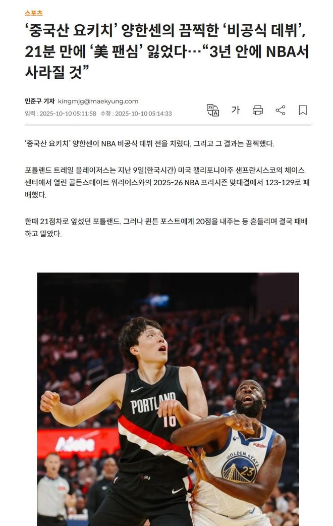 众所周知,在最近结束的开拓者NBA季前赛上,杨瀚森表现相当一般,和之前外界的预期相差甚远。这场比赛他仅仅拿到4分,还拿到了六个犯规和4个失误,整体表现在整个球队当中算得上倒数第一或者第二的这样的表现。和之前夏季联赛对比起来,无疑让很多球迷产生了巨大的落差。大家都担心他到底能不能够在NBA发展,他能不能够像当初的前辈姚明一样,在篮球的最高殿堂闯出一片天。随着这场比赛结束后,目前韩国媒体也是看热闹不嫌事大,在他们的社交平台刊登了一篇文章,点评了本次杨瀚森NBA季前赛的首秀。还引用了国外网友的一句话,认为这位中国的约基奇在三年内必定会在NBA消失。从这家媒体的报道我们可以了解到,首先他们大概罗列了本场比赛的一些表现和数据,其中重点提到开拓者一开始以21分的优势领先,结果最终却被勇士队反超,拿下了比赛。其中,杨瀚森的表现糟糕。他们还引用了一句话,认为杨瀚森在三年内必在NBA消失。可以说,韩国媒体给出这样的评价是非常过分的,因为这仅仅是一场季前赛而已,并非常规赛更不是季后赛。而且杨瀚森只是一个刚刚出道的新人,什么都不懂,第一次参加这种高级别对抗的比赛,自然适应不了节奏,他还需要时间成长。虽然这一次季前赛的首秀很难人让人满意,但实际上也没有那么不堪。反倒是韩国媒体看热闹不嫌事儿大,说出这样的话其实是非常离谱的。还记得在之前杨瀚森参加NBA选秀的时候,有很多外国媒体就不看好他,也根本想象不到他会在首轮被16顺位选中。而如今杨瀚森终于成为了中国球员的骄傲,这些媒体又开始以各种各样的方式去质疑这名中国球员。在这样的情况下,我们球迷就更加要支持我们自己的球员,相信他能够在NBA打出好的成绩。其实作为一名NBA年轻的新秀,如果杨瀚森可以在新赛季第一年不断的成长,不断的进步,一场比一场打的出色坐稳轮换的位置,其实就已经足够了。况且按照合同的约定,杨瀚森起码有两年的时间可以好好升级打怪,所以我们根本不需着急,期待他有朝一日能够打脸那一些质疑自己的人。