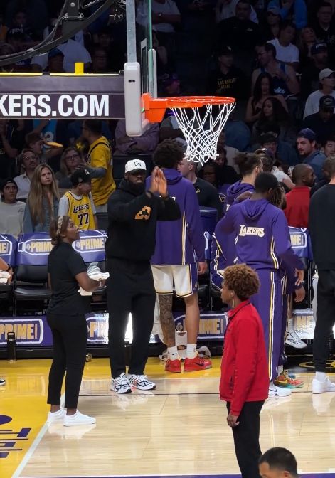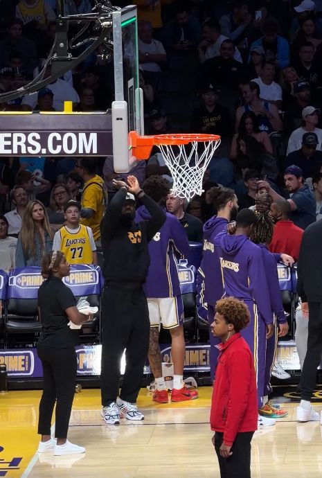 雷速体育10月13日讯 NBA季前赛继续进行,湖人今天在主场迎战勇士,勒布朗因为坐骨神经痛缺席本场比赛。比赛间隙,场边的勒布朗对着篮筐虚空练习投篮。