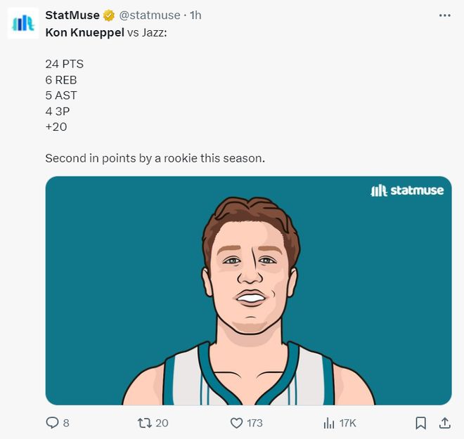 北京时间11月3日,黄蜂128-103大胜爵士,黄蜂拿下本赛季第三场胜利,目前3胜4负。此役是一场一边倒的比赛,黄蜂首节就领先14分,半场拉开到23分,两队分差最大时达到29分,末节两队都开始练兵。此役黄蜂的三个新秀都以先发身份登场:克努佩尔、西恩-詹姆斯、卡尔克布伦纳。克努佩尔是今年四号秀,西恩是今年33号秀,而这两人还都来自名校杜克大学,两人都被寄予厚望!克努佩尔在第二节还戳伤了两个手指,他是带着投篮手两根手指戳伤在鏖战,但作为顶级投手,这样的伤势并没有影响他。全场比赛克努佩尔35分钟,17中9,三分9中4,拿到24分6篮板5助攻1抢断,命中率52.9%,三分命中率44.4%,在没有三球的情况下他甚至承担了一些三球的工作。这场比赛克努佩尔也完成了一些纪录:1.他拿到了本届新秀截至目前的第二高分24分;2.24分是他个人生涯新高;3.5次助攻也是他个人生涯新高;4.他7场比赛命中超过20+三分,他是22个,追平NBA最快场次20+三双纪录。这场比赛后克努佩尔场均30.1分钟,拿到14分4.9篮板2.2助攻,真实命中率61.6%,三分命中率43.1%,他的表现越来越出色,黄蜂这个4号签并没有水。赛后主帅查尔斯-李同时称赞了西恩、克努佩尔两人,他觉得这两人都是有能力在NBA打出风采的新秀球员。今夏黄蜂用四号签选中克努佩尔时引发了巨大的争议,因为克努佩尔是一个纯投手,防守不佳、持球能力不足、身体对抗不行、尺寸也不足,但目前他在新秀榜上排名是第三的存在。