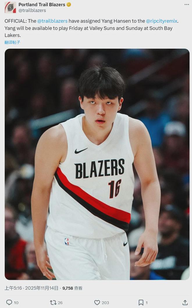 杨瀚森并不是发展联盟的专属球员,工资依然由开拓者发放。杨瀚森的合同4年2139万美元,本赛季薪水442万美元,下赛季464万美元,合同最后两年均是球队选项。开拓者附属的混音队本赛季在发展联盟2胜0负,球队大名单如下: