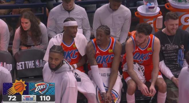 没有悬念的比赛,让我印象最深刻的回合是一个冲突。第三节,输急眼的知名“恶汉”格雷森-阿伦,掩护时直接抬肘放倒了切特,切特起来打算理论,杰威上去准备出头,两边队友纠缠到一起。最终裁判观看录像,二级恶意直接驱逐了阿伦。SGA的表情,亮了。