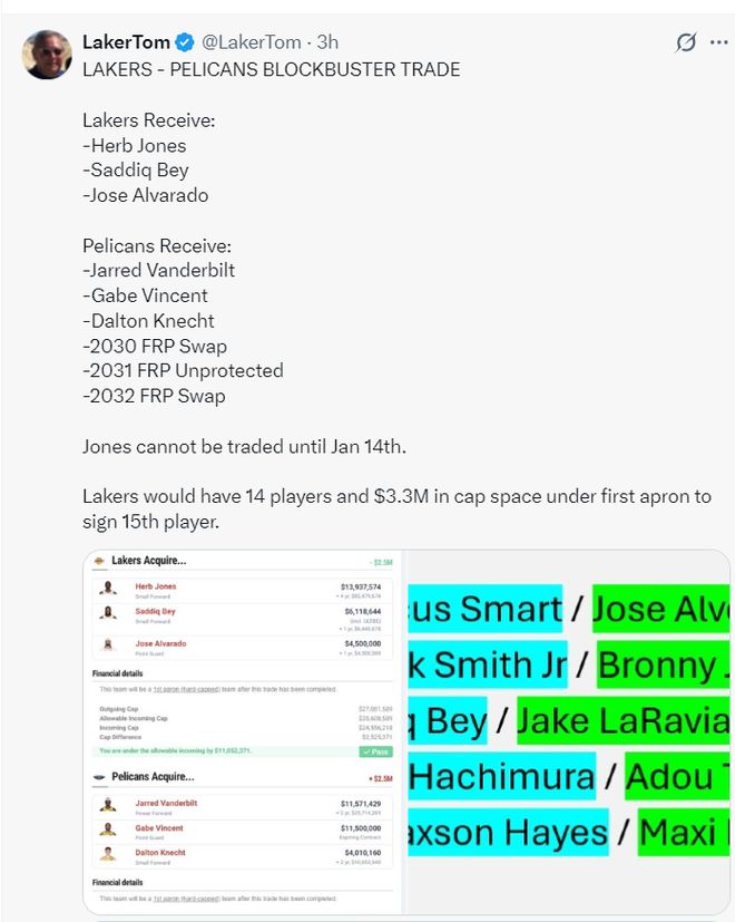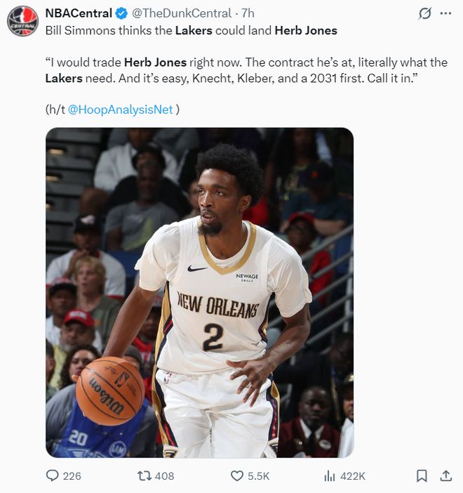 湖人媒体laker Tom为湖人模拟了一套大交易方案,他认为湖人不该只交易赫伯特-琼斯一人,湖人应该借此机会扩大交易进行超级补强。湖人得到:赫伯特-琼斯、萨迪克-贝、阿尔瓦拉多;琼斯得到:范德比尔特、文森特、克内克特、2030年首轮互换权、2031年不保护首轮签、2032年首轮互换权。