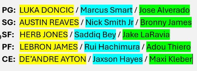 他还列出了湖人全新的15人名单,前提是将尼克-史密斯的双向合同转正:PG:东契奇、斯玛特、阿尔瓦拉多;SG:里夫斯、史密斯、布朗尼;SG:赫伯特-琼斯、萨迪克-贝、拉拉维亚;大前锋:詹姆斯、八村垒、蒂耶罗;中锋:艾顿、海斯、克勒贝尔;