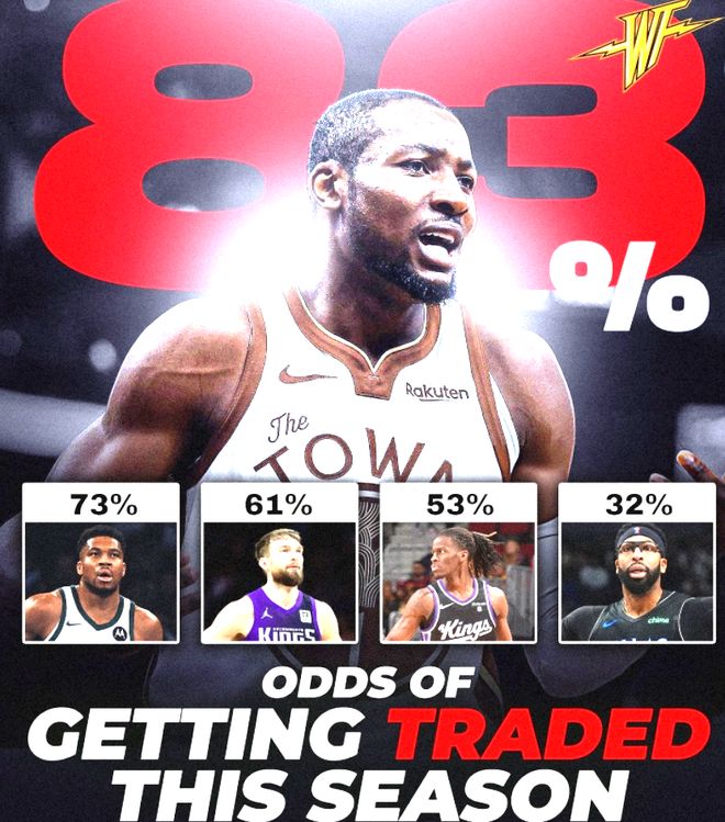 第四个劲爆消息是勇士有意拿库明加换特纳!随着交易截止日的临近,各队的交易动向逐渐清晰,本赛季各球员被交易的概率榜单也随之曝光。榜单显示,勇士球员乔纳森·库明加以83%的概率位居第一,雄鹿球星扬尼斯·阿德托昆博以73%紧随其后,国王中锋多曼塔斯·萨博尼斯(61%)、国王后卫基翁·埃利斯(53%)以及前文提及的安东尼·戴维斯(32%)分别位列第三至第五位。