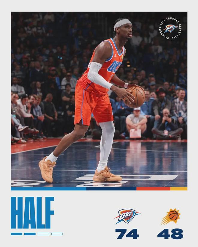 第二节雷霆36-25,单节净胜太阳11分。上半场打完,雷霆74-48领先太阳。雷霆上半场三分球19中13,三分命中率高达68.4%。在本场比赛之前,本赛季雷霆场均命中13.9记三分,联盟第11位。雷霆三分命中率37.4%,联盟第6。