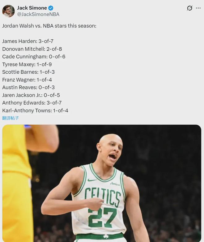 2023年NBA选秀大会,沃尔什在第38顺位被国王选中,随即被送到凯尔特人。新秀赛季场均1.7分2.2篮板,三分命中率仅有22.2%。苦练两年半,如今沃尔什终于把三分球开发出来了。继续加油吧,年轻人!