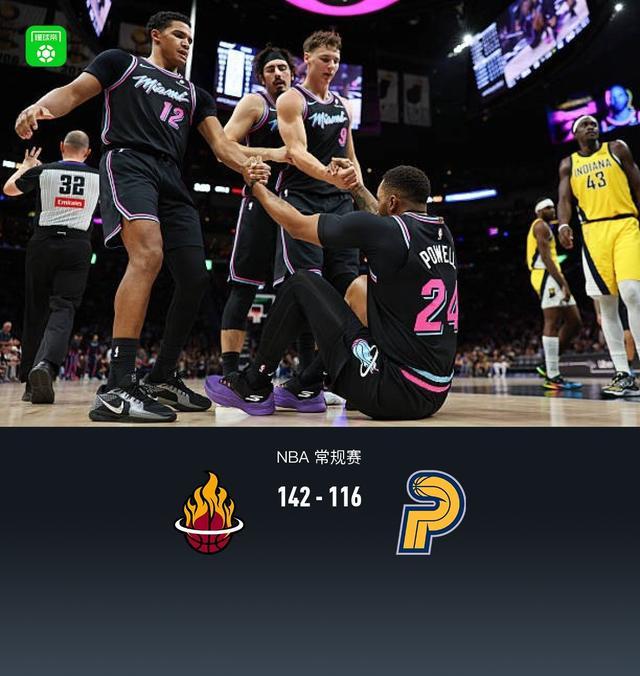 北京时间12月28日NBA 常规赛,迈阿密热火对阵印第安纳步行者。半场热火59-60步行者,最终热火142-116步行者。迈阿密热火维金斯28分6板3助,哈克斯28分6板3助;印第安纳步行者西亚卡姆33分7板5助,马图林25分6板。赛况第一节热火哈克斯拿下8分,步行者西亚卡姆拿下11分,首节战罢热火29-28领先步行者第二节热火诺曼-鲍威尔拿下7分,步行者西亚卡姆拿下13分,半场结束热火59-60落后步行者第三节热火维金斯拿下11分,步行者内姆布哈德拿下13分,第三节结束热火98-94领先步行者第四节热火尼古拉-约维奇拿下10分,步行者马图林拿下13分,最终热火142-116战胜步行者球员全场数据迈阿密热火维金斯28分6板3助3断1帽,哈克斯28分6板3助1断,诺曼-鲍威尔23分5板1助1断1帽;印第安纳步行者西亚卡姆33分7板5助2断,马图林25分6板2断,内姆布哈德15分3板16助。首发阵容迈阿密热火:维金斯,诺曼-鲍威尔,拉尔森,凯尔-韦尔,达维昂-米切尔;印第安纳步行者:西亚卡姆,马图林,内姆布哈德,杰-赫夫,弗菲。