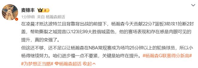 这场比赛国内的媒体人开始为小杨点赞,别跑刚背猪:杨瀚森这段时间折返跑跟得上了,呼吸也喘的过来。G联赛的比赛打30分钟不是问题,不过他的强度还是比较差,下一步就是提升强度,力量、爆发力各种无氧内容,这一关只要顺利跨过去,应该就可以在NBA打稳定时间。