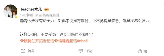 木凡:这场比赛感觉杨瀚森没有发全力,对于他来说是背靠背也不是觉得疲累就是觉得没怎么发力,不要受伤,达到训练目的就可以。