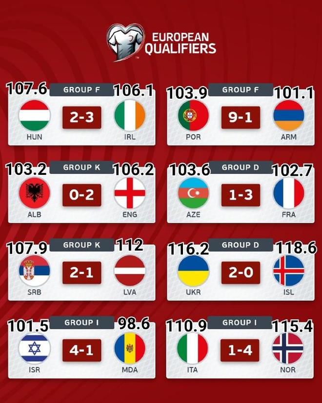 从世预赛统计数据可以看到,除了乌克兰队2比0击败冰岛队,以及意大利与挪威队的比赛,4支球队完成了让人吃惊的跑动量,其他比赛的平均跑动量甚至低于105公里。这一点或许也跟不少球队已经提前晋级,以及世预赛欧洲区不少比赛强弱分明有关系。只有涉及到晋级名额时,才有可能出现拼到你死我活的场面。