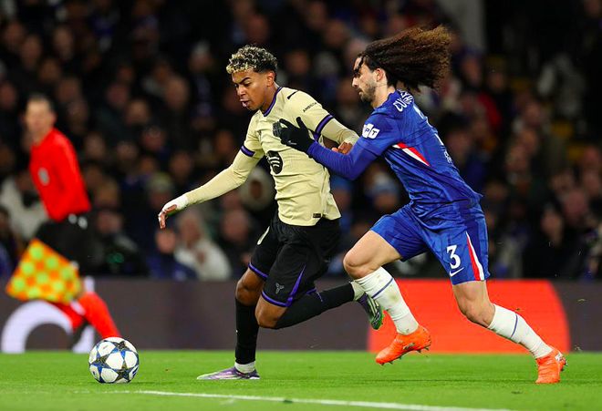 客场作战的巴萨频频使用造越位的战术,难免马失前蹄,在进攻端,至少前30分钟,亚马尔没有什么表现。反倒是领先后的切尔西气势如虹,第32分钟,里斯·詹姆斯插上的兜射稍稍偏出,巴萨门前风声鹤唳。