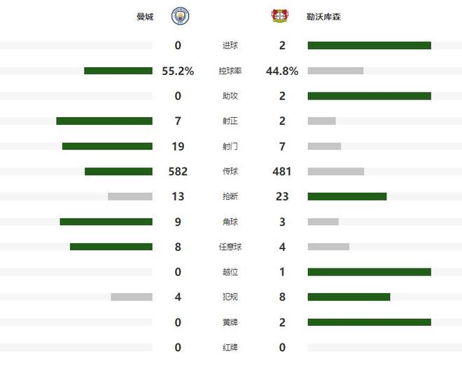 蓝月军团曼城在国际比赛日结束后的首战,就遭遇打击,英超联赛第十二轮客场输给了纽卡斯尔联队,不仅停下了连胜的脚步,积分榜上也被切尔西反超,跌至英超第三,本周曼城面临一周双赛的考验,周中欧冠第一阶段第五轮,坐镇伊蒂哈德球场迎战勒沃库森,本场比赛瓜迪奥拉整活给自己的里程碑之战添堵,勒沃库森靠着格里马尔多和希克的进球,2-0送给了曼城两连败。休赛期换帅的勒沃库森,在欧冠赛场表现不佳,前四轮仅仅取得了1胜2平1负的战绩,想要保住晋级第二阶段淘汰赛的希望,必须触底反弹拿到更多的积分,但是想要从伊蒂哈德球场全身而退绝非易事,曼城在欧冠赛场已经在自己的主场13连斩德甲球队,13场比赛一共只丢了13个球,而进球数则达到了49个。此战是瓜迪奥拉执教曼城的第100场欧冠比赛,不过瓜帅似乎并没有那么重视,在首发阵容中整活,多纳鲁马、格瓦迪奥尔、福登和哈兰德等多名核心在替补席待命,在4231的阵型中,让特拉福德镇守龙门,努里、阿克、斯通斯和胡桑诺夫构筑后防,冈萨雷斯和刘易斯搭档双后腰,萨维尼奥、赖因德斯和鲍勃坐镇中场,单箭头则是马尔穆什。比赛刚刚开打第6分钟,曼城就利用角球机会,制造出了威胁,阿克门前近在咫尺的打门,被药厂门将神扑化解,6分钟之后,勒沃库森给予强势回应,大禁区内无人盯防的波库,大力轰门被努里关键封堵挡出,第20分钟赖因德斯左路带球杀入禁区后左脚轰门,被后卫挡了一下后,被药厂门将轻松没收。第25分钟勒沃库森利用一次反击的机会,攻破了曼城的球门,科法内接到队友横传球后,顺势做给了左路跟进的格里马尔多,后者迎球抽射建功,帮助客场作战的勒沃库森,取得了1-0的领先,半场比赛结束之前,鲍勃右路横敲门前,被药厂门将伸腿挡出,化解了险情。下半场瓜迪奥拉一口气换上了福登、奥赖利和多库,想要加强球队的进攻,不过第54分钟勒沃库森就给了主队沉重一击,身高1米91的大中锋希克,接到队友45°传中后,头球破门得分,帮助勒沃库森将领先的优势扩大到了2球。第65分钟瓜迪奥拉再次做出换人调整,哈兰德和谢尔基披挂上阵,意味着蓝月军团要在主场发起最后的反扑,第71分钟哈兰德禁区内小角度打门被封堵,2分钟之后挪威魔人点球点附近的抽射又放了高射炮,连续浪费机会的曼城,只能眼睁睁看着勒沃库森从自己的主场带走了胜利。【本场数据】随着这一场比赛终场哨声的响起,曼城欧冠主场面对德甲球队的13连胜戛然而止,接下来他们将获得2天的休整时间,随后回到联赛迎战利兹联,能否击败对手止住连败颓势,让我们拭目以待。