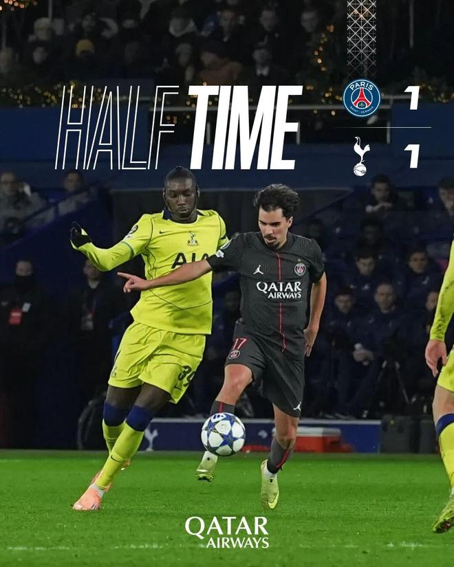 上半场第35分钟,热刺凭借里沙利松的头球破门首开纪录,我们暂时0-1落后。第45分钟,维蒂尼亚弧顶迎球抽射扳平比分!1-1!