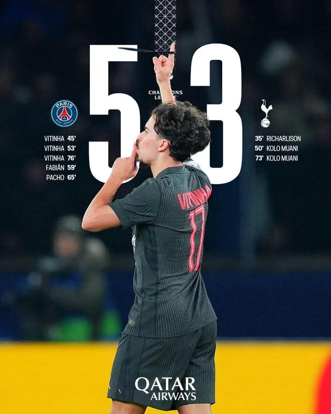 第73分钟,穆阿尼梅开二度,热刺把比分追至4-3。第76分钟,我们获得点球机会,维蒂尼亚主罚命中,上演帽子戏法!5-3!