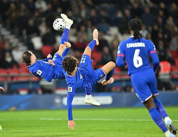 从这球也可以看出,德尚可能对442都没有进行太多的演练,埃基蒂克在跑位上和姆巴佩差点撞车。姆巴佩在俱乐部和国家队的最近10场比赛中均有进球,创下职业生涯最佳连场进球纪录。德尚在下半时对方体能明显消耗殆尽的情况下才让球队提速。第69分钟姆巴佩再度建功,他在左侧的横传找到了后点的拉比奥,后者甩头破网,2比0.。让德尚揪心的是,15分钟后,姆巴佩因右脚踝受伤离场。替补姆巴佩出场的托万,在时隔多年回归国家队的第一场比赛立即取得进球,他在禁区前左侧策动进攻,然后在门前接到特奥的传球,冷静调整后半转身凌空抽射破门。托万虽然是2018世界杯冠军队成员,但已经6年没有得到德尚的青睐,他是在巴尔科拉受伤后被临时召入球队的,这次回归堪称完美。