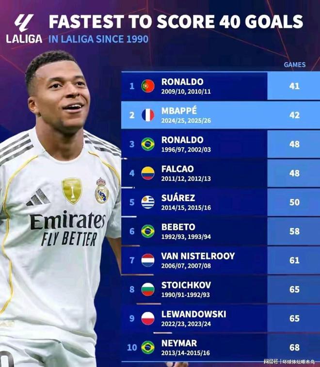 请点击本文右上角的关注,感谢您的支持10月8日,当足球世界的目光仍聚焦于姆巴佩在皇家马德里的融入与表现时,一份来自德国转会市场(德转)的权威统计,为这位法国巨星的首个西甲赛季写下了浓墨重彩的一笔。数据显示,姆巴佩仅用42场比赛便攻入40粒西甲进球,这一效率高居自1990年以来西甲历史第二位,仅次于传奇前锋C罗的41场,甚至超越了“外星人”罗纳尔多。这不仅仅是一个冰冷的数字,它宣告着一位新的王者正在伯纳乌的星空下冉冉升起。在上周末皇马3-1战胜比利亚雷亚尔的比赛中,姆巴佩的进球不仅为球队锁定胜局,更成为了他个人西甲生涯的一个里程碑。这粒进球是他本赛季的第9粒联赛进球,也是他身披白衣战袍的第40球。从初来乍到时的万众瞩目,到如今用一个个进球击碎所有质疑,姆巴佩正以最直接、最纯粹的方式,回应着这座拥有无数传奇的伟大球场的期待要理解这一成就的含金量,我们必须将其置于西甲悠久而辉煌的历史长河中。自1990年以来,这片赛场见证了无数顶级射手的诞生。从“独狼”罗马里奥到“指环王”劳尔,从“猎豹”埃托奥到“葫芦娃”比利亚,再到梅西与C罗绝代双骄的时代,能在西甲留下浓重一笔的前锋,无一不是足球史上的传奇人物。而姆巴佩,以42场40球的恐怖效率,将自己的名字刻在了这份星光熠熠的榜单前列。他身前,是C罗——一位在皇马九年时间里,将进球演绎成一种艺术、将胜利变成一种习惯的超级偶像。C罗用41场达成40球的纪录,是其在巅峰时期无与伦比的统治力的体现。而姆巴佩能够如此接近这一神迹,甚至在效率上超越了巅峰时期的大罗(48场40球),这本身就说明了他的非凡之处。大罗以其无与伦比的速度、爆发力和技术征服了世界,而姆巴佩则用同样的方式,结合了现代足球更快的节奏和更严密的防守,展现出了属于新时代的锋线统治力。这份榜单的意义远不止于速度。它背后是持续性的高效输出。在42场比赛中保持场均接近一球的进球率,要求球员不仅具备顶级的射术和爆发力,更需要拥有应对密集赛程、伤病困扰以及对手针对性布防的强大综合能力。姆巴佩在皇马的角色,从最初需要适应的边锋,到如今游刃有余的“终结者”,他正在不断进化。他的进球方式多种多样,既有风驰电掣的反击单刀,也有禁区内冷静的抢点射门,更有不讲理的暴力远射。这种全面性,让他成为了任何防线都难以遏制的噩梦。更值得深思的是,姆巴佩的成就诞生于一个后梅西、C罗时代。当西甲联赛的“二人转”大幕落下,人们曾一度思考,谁将成为下一个扛起联赛进攻大旗的旗帜。姆巴佩的到来,以及他如此迅速地融入并爆发,无疑给了这个问题一个响亮的回答。他正在用自己的表现,填补两位传奇留下的空白,开启一个属于他的“姆巴佩时代”。