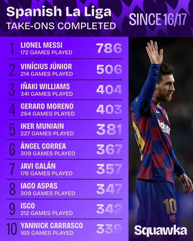 10月12日。有权威机构Squawka统计并公布了从2017赛季至今所有球员在西甲的成功过人次数排行榜前十。其中已经离开西甲四年、相当于让了五个赛季的梅西,依旧排名独一档!2016-2017赛季至今,西甲过人王是从2021年就离开西甲的梅西,一共有786次。梅西不仅仅是西甲过人王,独一档的那种,还是足球历史上的过人王。而且梅西的过人通常都是连续过人、破包夹、秀技术那种,因此他实际的过人水平比他的过人数据还要可怕。同期第二是维尼修斯,比梅西少了快300次,一共是506次。维尼修斯时不时被报道可能去沙特或者离开皇马,可能等他离开西甲,都不一定能超过梅西。但维尼修斯已经算猛的了,他比第三多了100次。第三是伊纳基·威廉姆斯,404次。榜单前十接下来算差不多,属于西甲过人比较厉害的球员基本水平。第四的莫雷诺,403次。穆尼亚因,381次。科雷亚,367次。阿斯帕斯,347次。伊斯科,342次。卡拉斯科,339次。梅西现在在迈阿密国际照样经常过人,时不时就是过人次数全场第一。迈阿密国际还算养生局的话,世界杯和美洲杯这样的国家高端局,梅西照样能过人。梅西的过人只是他统治世界足坛十几年的一个标志而已,这是他伟大的佐证,而不是素材。