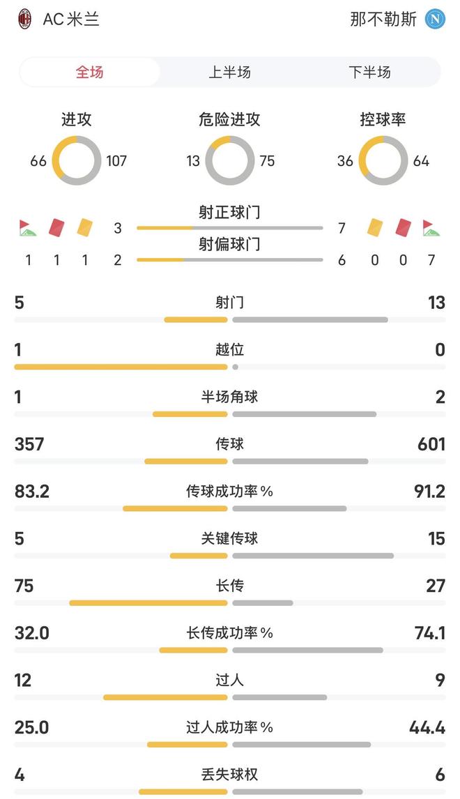 米兰vs那不勒斯全场数据:射正37,控球率36比64