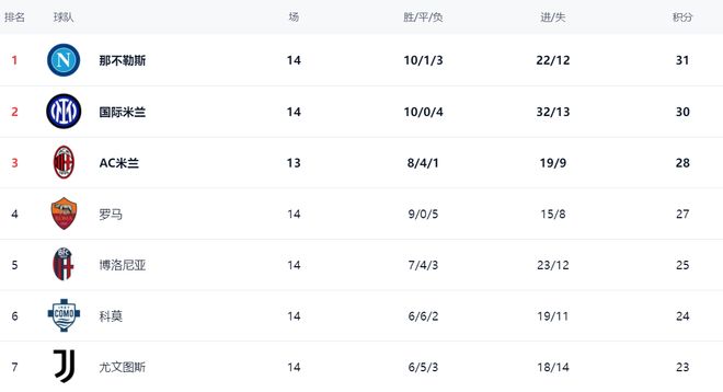 意甲积分榜上,争冠形势乱了,榜首已经易主。那不勒斯登上了榜首位置。那不勒斯10胜1平3负,拿到31分。而国际米兰的战绩稍微逊色,只拿到30分,掉到了第2名。AC米兰则以28分排名第3。不过,AC米兰比那不勒斯国际米兰少踢1场,接下来有夺回榜首位置的希望。罗马依然停留在27分,排名第4,与榜首的差距是4分,不算太大。