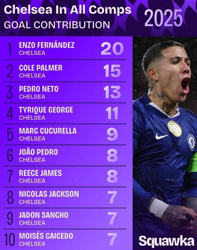 本场比赛埃斯特旺首发登场表现出色,打进一球,8次射门3次射正,还有2次关键传球,他也当选切尔西官方评选出的本场比赛队内最佳球员。此外,埃斯特旺对阵阿贾克斯进攻三区触球63次,创造本赛季欧冠纪录。消息来源:欧冠官网3 - 切尔西制造机会数对比数据网站Squawka盘点了2025年切尔西球员各项赛事参与进球榜单,具体如下(进球+助攻):