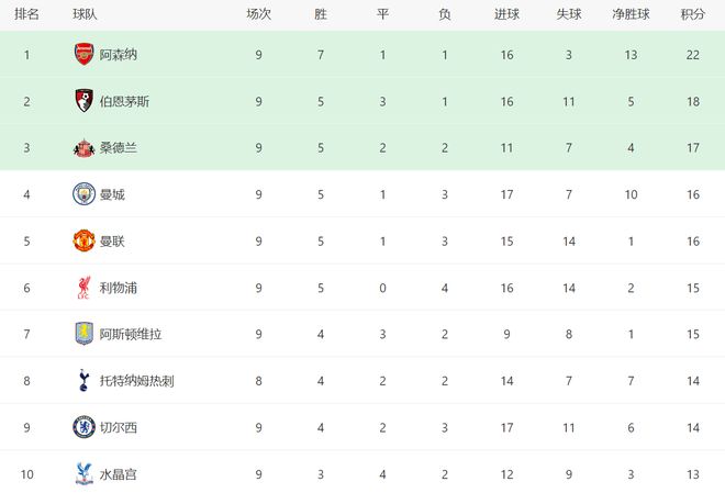 北京时间10月26日晚上,英超联赛第九轮结束了多场比赛,曼城客场0-1输给阿斯顿维拉,阿森纳主场1-0击败水晶宫,伯恩茅斯主场2-0战胜诺丁汉森林,接下来看看每场比赛的简单综述。前一个比赛日,利物浦、切尔西、曼联三家豪门各有胜负,切尔西主场1-2爆冷不敌桑德兰,曼联主场4-2击败布莱顿,利物浦客场2-3爆冷输给布伦特福德。主场面对升班马桑德兰,切尔西先赢后输,最终1-2遭到逆转绝杀,各项赛事四连胜被终结,同时继2014年4月以来之后,首次在斯坦福球场输给桑德兰。主场面对布莱顿,曼联延续了近期火热状态,依靠库尼亚、卡塞米罗、姆伯莫的联袂破门,最终4-2拿下,终结主场对阵布莱顿的三连败。据统计,曼联本赛季至今英超主场拿分最多的球队,5场比赛拿到12分。客场面对布伦特福德,利物浦还是没有走出近期联赛的状态低迷期,最终2-4输球,遭遇联赛4连败,已经追平了上赛季全部的输球场次。此外,利物浦的积分榜排名继续下降,一个月之前还是领头羊球队。曼城VS阿斯顿维拉过去两个赛季,曼城客场对阵维拉连续输球,并且上一次取胜还得追溯到2021年的时候。上半场,曼城控球率46%处于下风,只有3次射门1次打正,没有获得角球机会,没有创造绝佳机会,维拉6次射门1次打正,正是来自卡什的破门,第39分钟,维拉战术角球开出,卡什调整后大力低射打进,比分1-0领先曼城。下半场,曼城持续冲击维拉的后防线,第88分钟,哈兰德飞身铲射破门,因马尔穆什越位在先,进球无效,最终0-1爆冷输给维拉。阿森纳VS水晶宫过去几个赛季,阿森纳主场面对水晶宫保持不败,包括上赛季2-2打平。上半场,阿森纳控球率66%占优情况下,3次射门2次打正,没有获得角球机会。直到第39分钟,阿森纳终于打破了僵局,赖斯主罚任意球送入禁区,埃泽抢到第二落点直接爆射破门,比分1-0领先。下半场,阿森纳继续掌控比赛局面,但未能扩大领先优势,最终还是1-0击败水晶宫,取得各项赛事7连胜。伯恩茅斯VS诺丁汉森林过去五个赛季,伯恩茅斯主场面对诺丁汉森林连续不败,包括上赛季5-0狂胜。上半场,伯恩茅斯基本主导了比赛走势,第24分钟,塔维尼耶主罚角球直接旋进球门,随后第39分钟,克鲁皮前场中路一脚低射打进球门左下角,帮助伯恩茅斯2-0领先。下半场,诺丁汉森林未能改写比分,最终客场0-2不敌伯恩茅斯。最新积分榜如下: