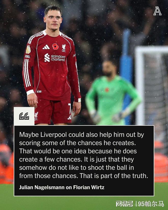斯洛特并不觉得自己陷入了教条主义的泥潭,他用举例子的方式为自己解释,也为维尔茨减压:“他在阿隆索的勒沃库森主要踢343体系中的边锋位置,而在此之前是出任10号位。”换而言之,暂时没有下课危机的利物浦主帅还会将信任票投给自家的7号。有意思的是,德国主帅纳格尔斯曼则用转移法为弟子打气:“维尔茨创造了一些机会,只是他的队友似乎不太愿意把这些机会转化为进球。”