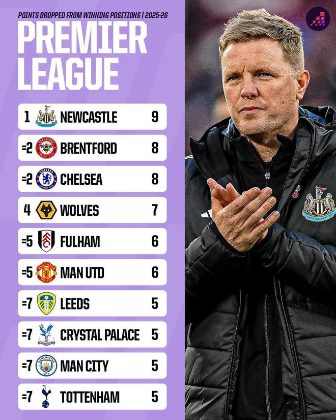 领先之后丢分最多的球队,丢掉多达9分,布伦特福德、切尔西并列次席。本赛季