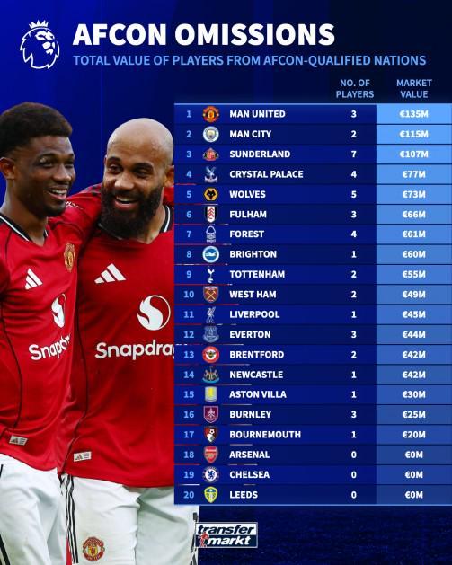 德转列英超各队非洲杯晋级国家球员总身价排名:1. 曼联 3人 1.35亿欧元姆伯莫(喀麦隆)7000万欧元、阿马德-迪亚洛(科特迪瓦)4000万欧元、马兹拉维(摩洛哥)2500万欧元2. 曼城 2人 1.15亿欧元马尔穆什(埃及)7500万欧元、艾特-努里(阿尔及利亚)4000万欧元3. 桑德兰 7人 1.07亿欧元哈比卜-迪亚拉(塞内加尔)3200万欧元、阿丁格拉(科特迪瓦)2500万欧元、塔勒比(摩洛哥)2000万欧元、萨迪基(民主刚果)1700万欧元、伯特兰-特拉奥雷(布基纳法索)500万欧元、雷尼尔多(莫桑比克)500万欧元、马苏亚库(民主刚果)300万欧元4. 水晶宫 4人 7700万欧元伊斯梅拉-萨尔(塞内加尔)3000万欧元、谢赫-杜库雷(马里)2000万欧元、克里桑图斯-乌切(尼日利亚)1500万欧元、沙迪-里亚德(摩洛哥)1200万欧元5. 狼队 5人 7300万欧元阿罗科达雷(尼日利亚)2500万欧元、阿格巴杜(科特迪瓦)2000万欧元、穆内西(津巴布韦)1500万欧元、查舒亚(喀麦隆)1200万欧元、奇雷瓦(津巴布韦)50万欧元6. 富勒姆 3人 6600万欧元伊沃比(尼日利亚)2800万欧元、巴锡(尼日利亚)2800万欧元、丘库埃泽(尼日利亚)1000万欧元7. 诺丁汉森林 4人 6100万欧元易卜拉欣-桑加雷(科特迪瓦)2400万欧元、埃纳(尼日利亚)2200万欧元、阿沃尼伊(尼日利亚)1400万欧元、博利(科特迪瓦)120万欧元8. 布莱顿 1人 6000万欧元巴莱巴(喀麦隆)6000万欧元9. 托特纳姆热刺 2人 5500万欧元帕普-萨尔(塞内加尔)3500万欧元、比苏马(马里)2000万欧元10. 西汉姆联 2人 4900万欧元哈吉-迪乌夫(塞内加尔)2500万欧元、万-比萨卡(民主刚果)2400万欧元11. 利物浦 1人 4500万欧元萨拉赫(埃及)4500万欧元12. 埃弗顿 3人 4400万欧元伊利曼-恩迪亚耶(塞内加尔)3500万欧元、阿兹努(摩洛哥)700万欧元、伊德里萨-盖伊(塞内加尔)150万欧元13. 布伦特福德 2人 4200万欧元丹戈-瓦塔拉(布基纳法索)3500万欧元、奥涅卡(尼日利亚)700万欧元14. 纽卡斯尔联 1人 4200万欧元维萨(民主刚果)4200万欧元15. 阿斯顿维拉 1人 3000万欧元盖桑(科特迪瓦)3000万欧元16. 伯恩利 3人 2500万欧元汉尼拔-梅布里(突尼斯)1200万欧元、福斯特(南非)800万欧元、图安泽贝(民主刚果)500万欧元17. 伯恩茅斯 1人 2000万欧元阿德利(摩洛哥)2000万欧元18. 阿森纳 0人19. 切尔西 0人20. 利兹联 0人【上咪咕独家看英超】