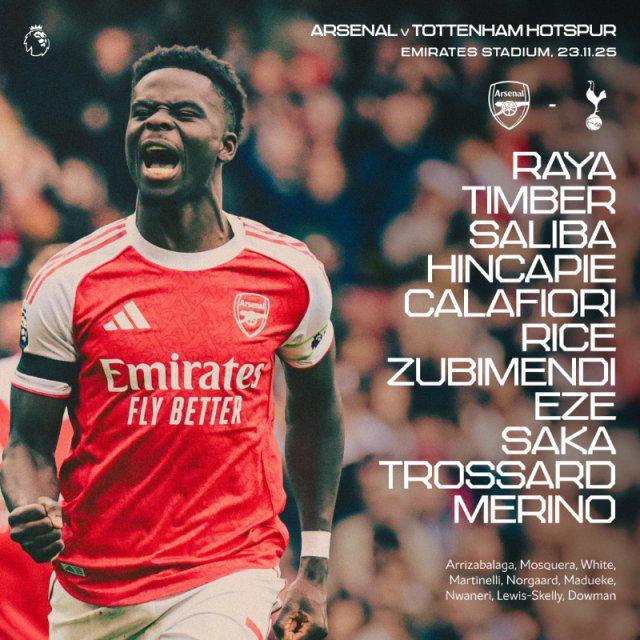 主场对垒热刺的首发阵容,来自勒沃库森的左脚后卫因卡皮耶替代受伤的加布里埃尔出任主力中卫与萨利巴搭档。哲凯赖什继续缺席,梅里诺客串中锋。此前养伤许久的马杜埃凯和马丁内利均进入大名单,但赛前同样曾在球迷面前露面的队长厄德高并不在名单。