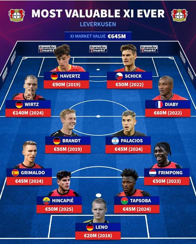 德转列勒沃库森历史最贵11人阵容:门将莱诺(2018年)2000万欧元后卫弗林蓬(2023年)5000万欧元、塔普索巴(2024年)4500万欧元、因卡皮耶(2025年)5000万欧元、格里马尔多(2024年)4500万欧元中场穆萨-迪亚比(2022年)6000万欧元、帕拉西奥斯(2024年)4500万欧元、布兰特(2019年)5000万欧元、维尔茨(2024年)1.4亿欧元前锋希克(2022年)5000万欧元、哈弗茨(2019年)9000万欧元总身价:6.45亿欧元【上咪咕独家看英超】