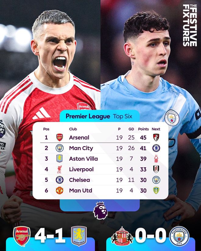 01月02报道 英超第19轮比赛全部战罢,曼城0-0桑德兰,阿森纳4-1战胜维拉。阿森纳领先优势扩大到4分。