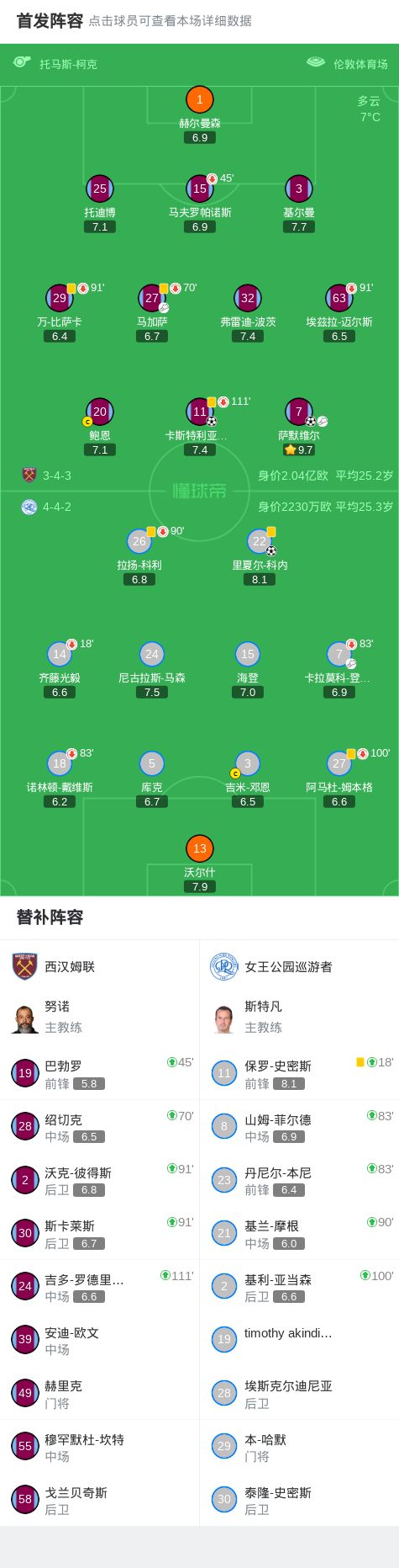 北京时间1月11日英格兰足总杯 第三轮,西汉姆联对阵女王公园巡游者。上半场补时阶段马加萨助攻萨默维尔破门。下半场卡拉莫科-登贝莱传中,里夏尔-科内头球破门。加时赛萨默维尔过人后传中,卡斯特利亚诺斯头球破门。最终西汉姆联2-1战胜女王公园巡游者晋级。