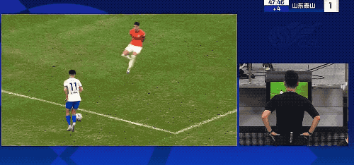 上半场补时阶段,刘洋传中,克雷桑包抄,刘军帅倒地封堵,皮球打在他的支撑手上,VAR介入,裁判判罚点球。