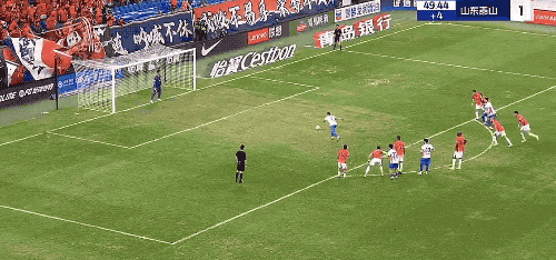 第60分钟,青岛海牛获得任意球,萨里奇的射门绕过人墙,王大雷扑了一下,皮球击中横梁。