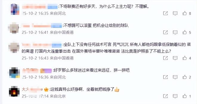 有的球迷将矛头直指北京国安的某些球员:“这钱挣得真容易,坐着就把钱挣了。”“冒充职业球员。”“范双杰还算是职业球员吗?”也有球迷对塞蒂恩的战术安排提出质疑:“下一轮中超还有好多天呢,为什么要轮换呢?不是说全主力打亚冠吗?”