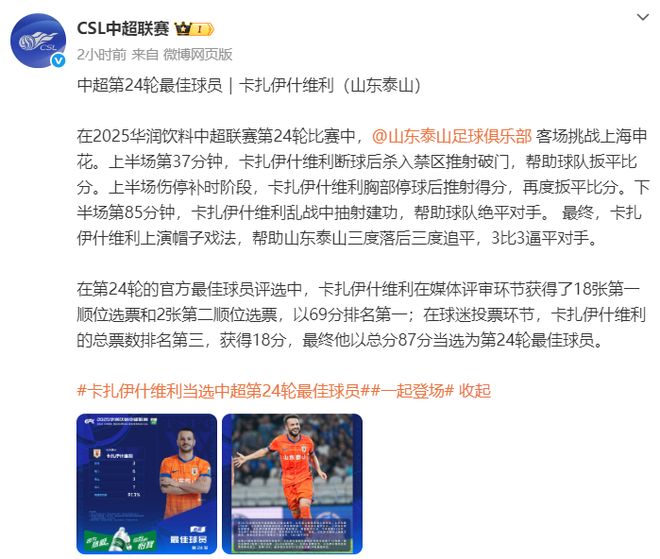 北京时间10月23日,中超联赛官方终于公布第24轮最佳球员人选,瓦科当选,这是他连续两轮当选最佳球员,不过这次评选长达10天。射手榜上,瓦科继续领跑,不过优势只剩下一球,本轮泰山队对阵海港的比赛,他和莱昂纳多的射手王之争也是一个看点。中超第24轮的最佳评选是10月13日开启,经过长达10天的评选后,结果终于公布。瓦科在第24轮对阵申花的比赛中上演帽子戏法,带队在客场3比3战平申花,他得到了69分的媒体评分,不过球迷投票只是排在第三位,得分是18分,总分是87分,当选单轮最佳球员。第23轮,瓦科是以99分的评分当选最佳球员,他连续两轮当选最佳球员,也是对他表现的认可。不过24轮之后,瓦科已经连续三轮没有进球,进球数一直停留在22球。第28轮,山东泰山将主场对阵上海海港,这场比赛决定海港的争冠走势,瓦科和莱昂纳多的金靴之争,也值得关注。其他数据方面,第27轮比赛,马德鲁加在对阵浙江的比赛中单场跑动距离是12689米,排名首位。这是马德鲁加本赛季第二次单轮跑动第一,上一次是主场对阵亚泰的比赛。对于马德鲁加来说,本赛季的中超联赛是一个适应磨合的过程,他的表现也有了提升。