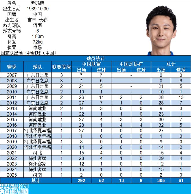 巅峰时期的尹鸿博也是国家队常客,跟随国足征战过世预赛、东亚杯、国际友谊赛。国家队生涯中,他累计出场14次,打进1球,送出6记助攻。本赛季,尹鸿博所属河南队,整个赛季仅出场2次。赛季结束后,他通过社媒宣布了退役的消息。